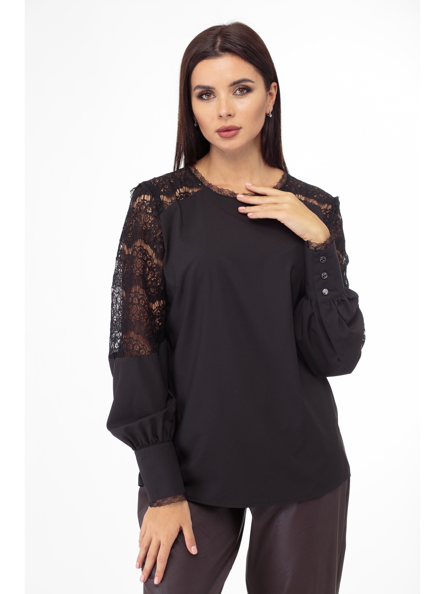 Прямой силуэт. По переду и спинке кружевные кокетки. Втачной рукав на манжете также имеет отделочные детали из кружевного тончайшего полотна. Округлый вырез горловины с отделкой из кружева. Застежка на пуговицы в среднем шве спинке.