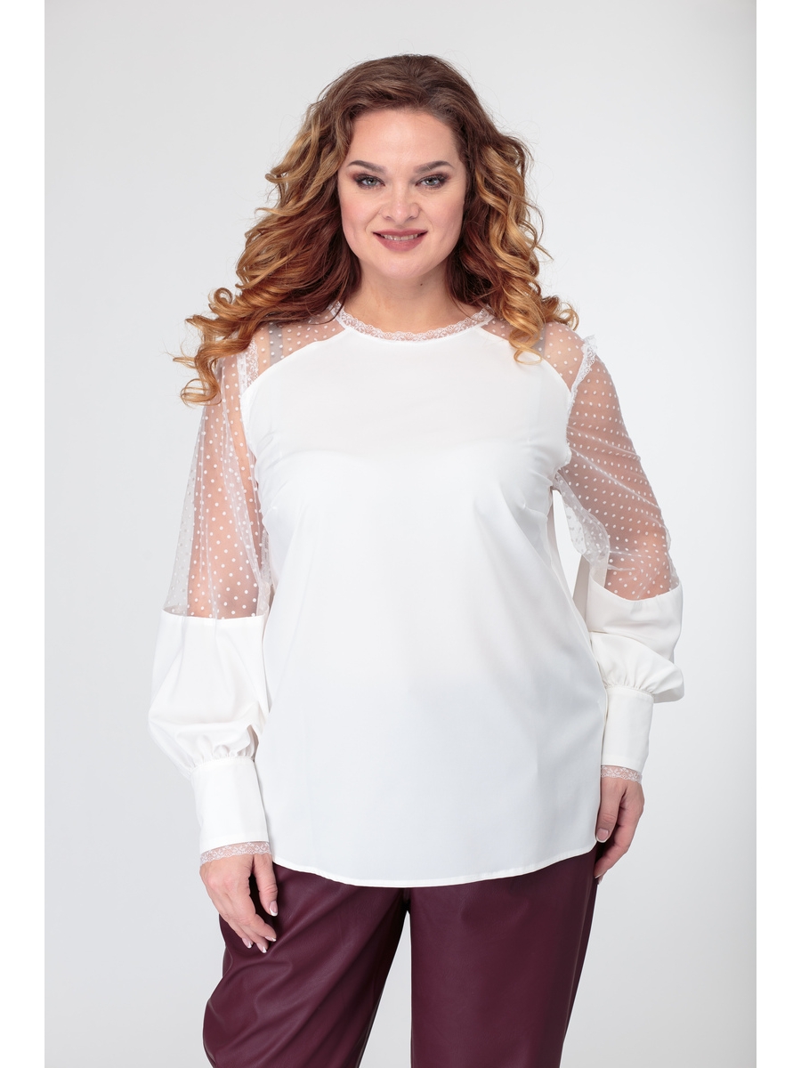 Прямой силуэт. По переду и спинке кружевные кокетки. Втачной рукав на манжете также имеет отделочные детали из кружевного тончайшего полотна. Округлый вырез горловины с отделкой из кружева. Застежка на пуговицы в среднем шве спинке.