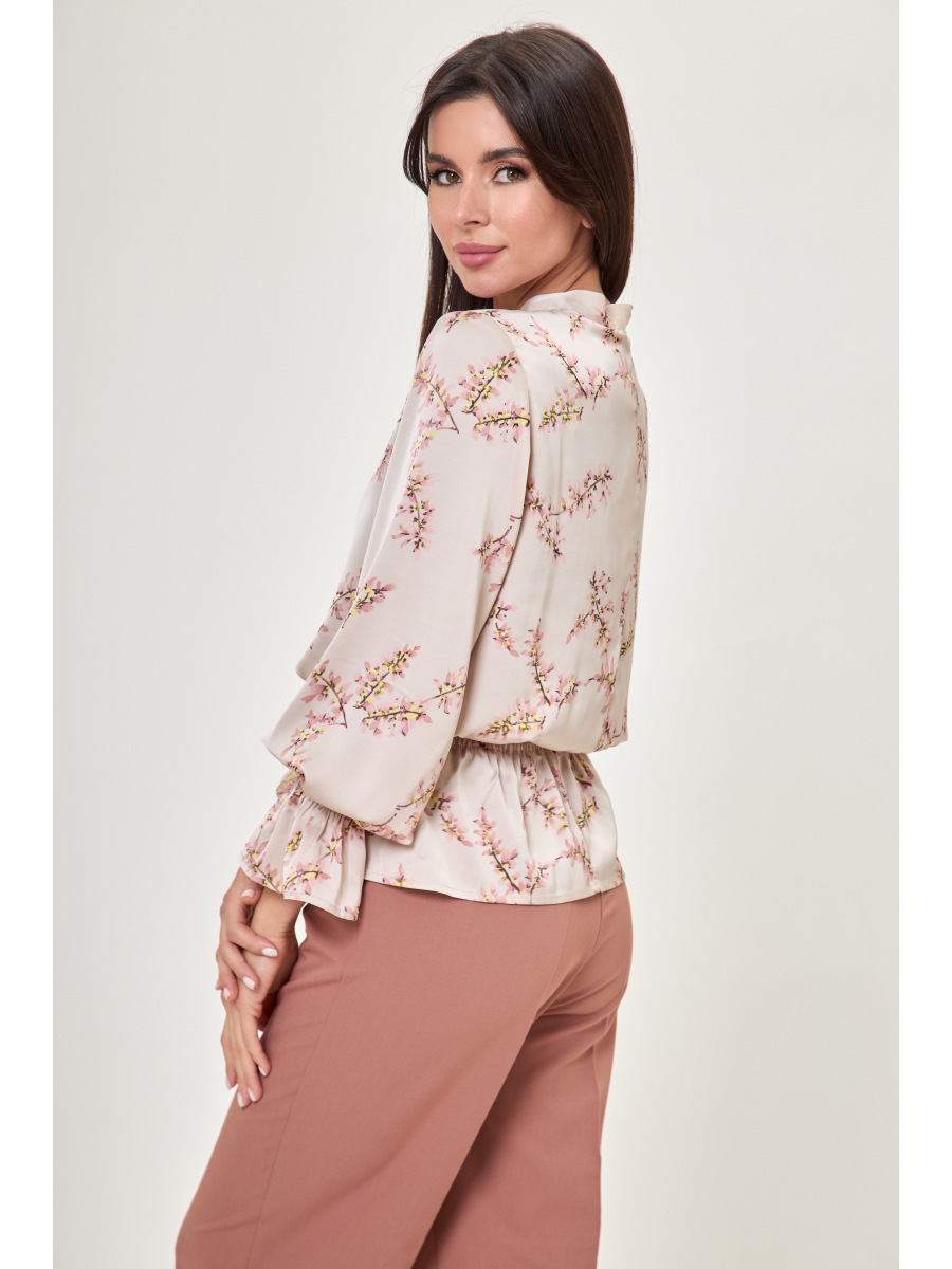 Линия плеча мягкой формы, рукав свободный, собран на резинку на запястье.
