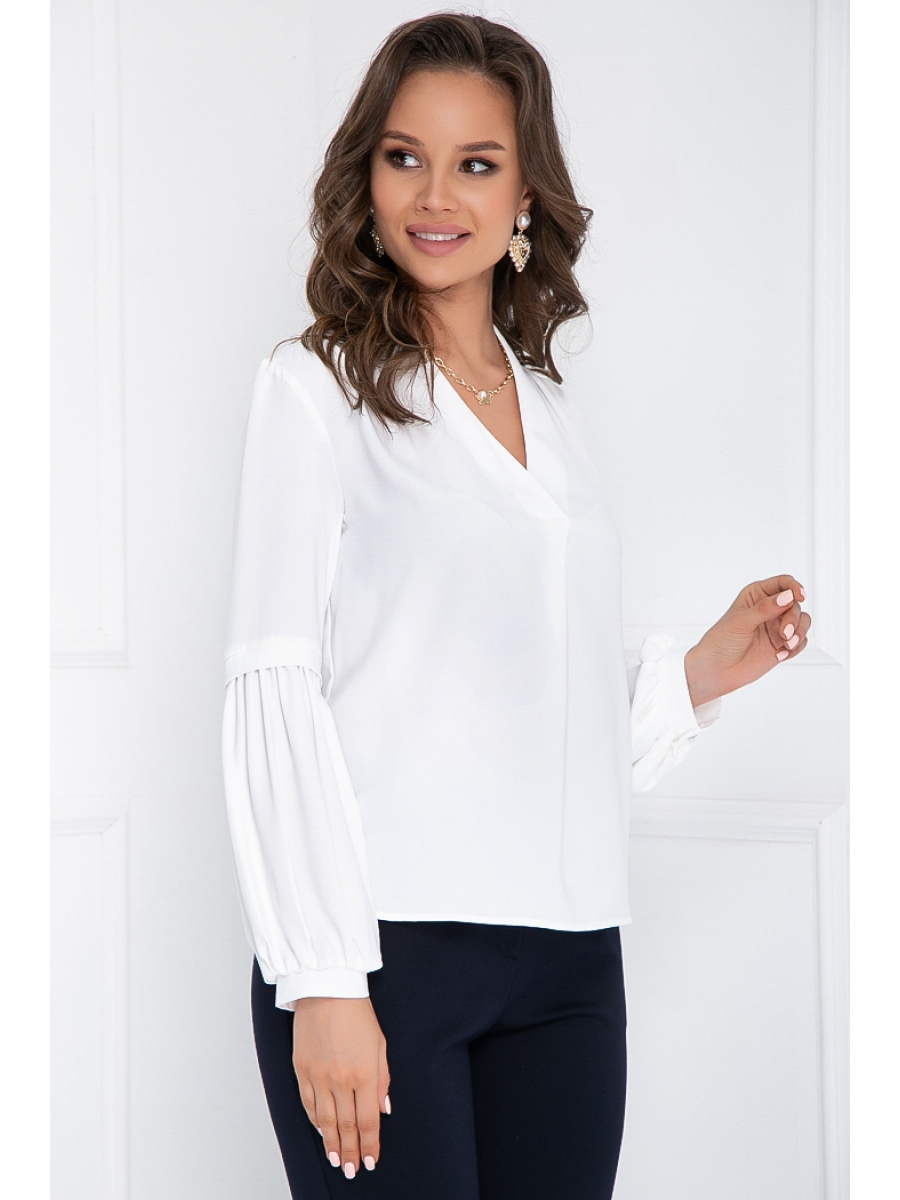 Бастилья – нарядная блузка с оригинальными рукавами-“фонариками”. Вырез ворота – классический V-образный, с оригинальным защипом, акцентирующим внимание на груди. Рукава длинные, с “фонариками” на предплечьях, оторочены изящными манжетами. В такой блузке вы будете неотразимы! Быть стильной и привлекательной легко вместе с “Белловера”!
