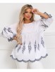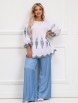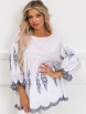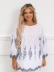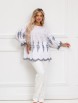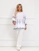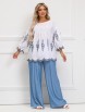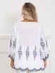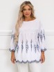 Нежная блузка свободного силуэта из текстильной ткани бело-синего цвета с кружевной вышивкой. Круглый вырез изделия обработан внутренней бейкой. По переду изделия отрезная кокетка дополненная сборкой. Блузка со спущенной проймой, втачные рукава обработаны окантовкой. Длина изделия по спинке от плечевого шва до низа изделия — 80 см.