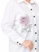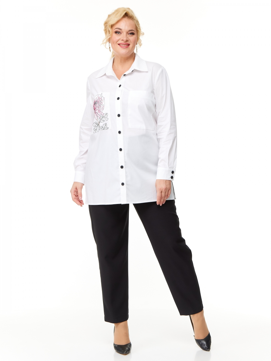 Блузка женская оверсайз типа «рубашка» – это универсальный предмет гардероба девушки. Блузка свободного силуэта. Воротник рубашечный отложной на стойке. Рукав втачной, одношовный, внизу на манжете, с застежкой на петлю-пуговицу. Внизу по боковым швам обработаны разрезы. Полочка с застежкой на петли-пуговицы, с накладными карманами. Оригинальным решением является авторская вышивка «Хризантема» на правой полочке и контрастные пуговицы. По спинке – кокетка. Белая рубашка считается эталоном стиля. Рубашка – это элемент одежды в любое время года и по любому случаю. Ткань не скатывается, держит форму.