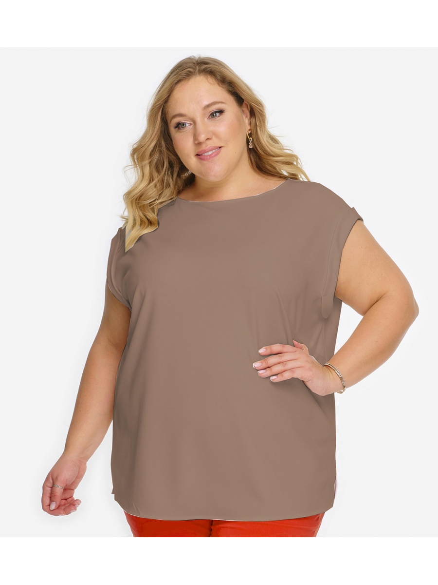 Блуза со спущенным плечом свободного силуэта из крепа с эластаном. В боковых швах разрезы. По проймам отвороты.