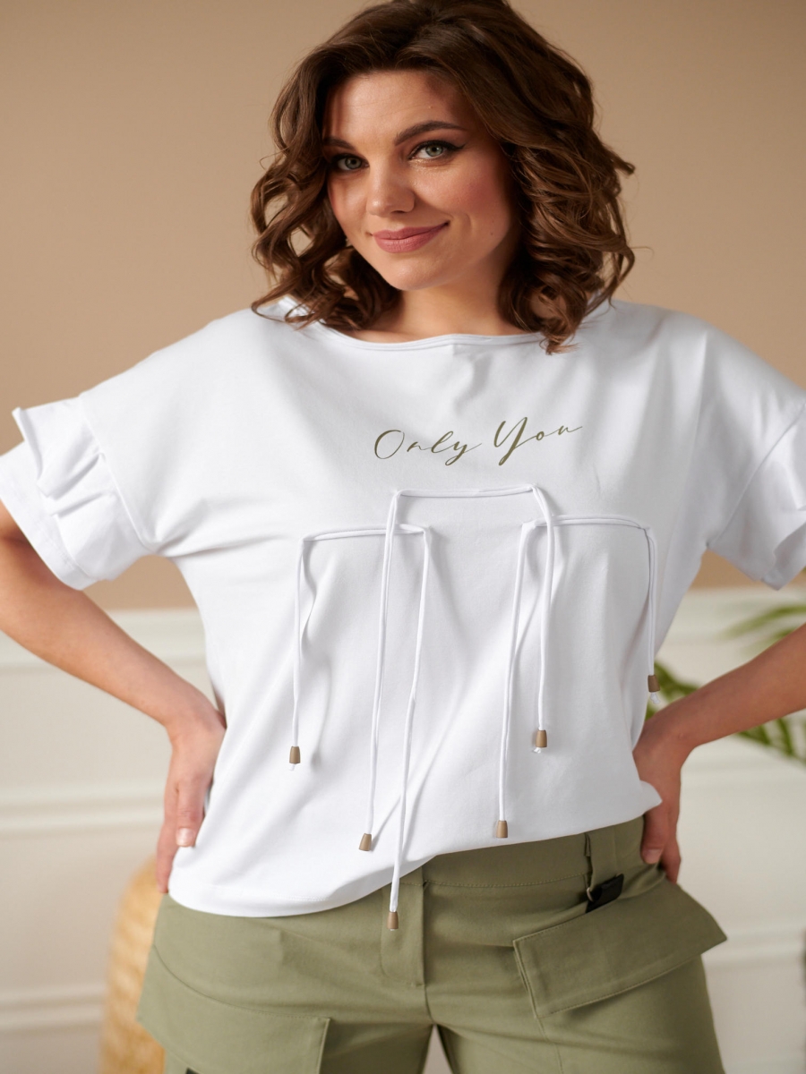 Джемпер полуприлегающего силуэта. По переду изделия расположен принт с настрочными шнурами и наконечниками. Короткий рукав с воланами. Вырез горловины круглый, обработан бейкой с необработанными краями. Спинка со средним швом.