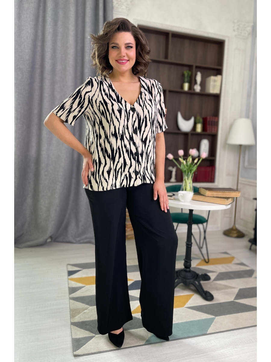 Блуза женская прямого силуэта. Рукав прямой втачной короткий. Вырез горловины треугольной формы. Блуза застегивается на "петьли-пуговицы".
