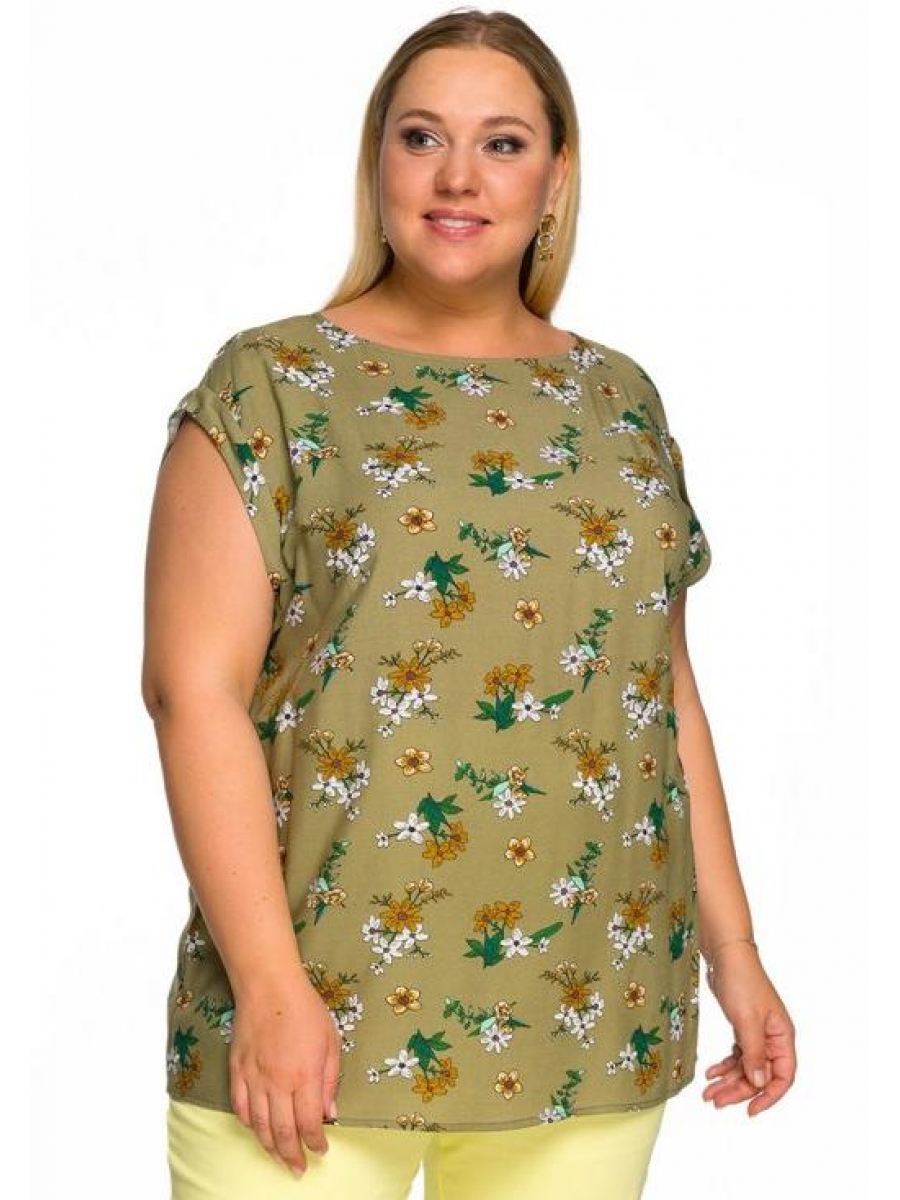 Блуза со спущенным плечом прямого кроя. Вырез горловины "лодочка". В боковых швах разрезы.