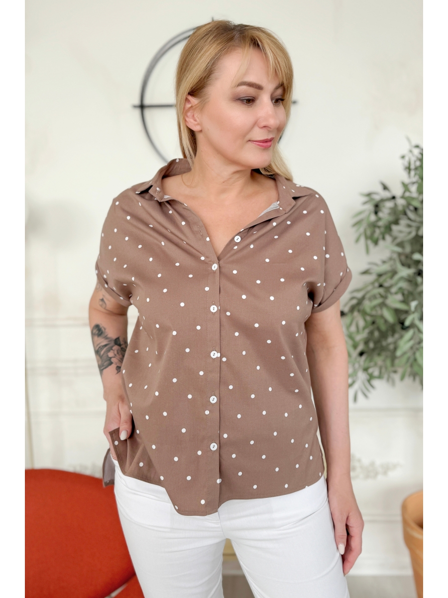 Блузка женская полуприлегающего силуэта со спущенным плечом. Блузка с притачной планкой на петлях-пуговицах. Горловина оформлена воротником со стойкой. Перед блузки сделан короче чем спинка (разница 10 см), по бокам разрезы. Пройма рукава обработана манжетой.