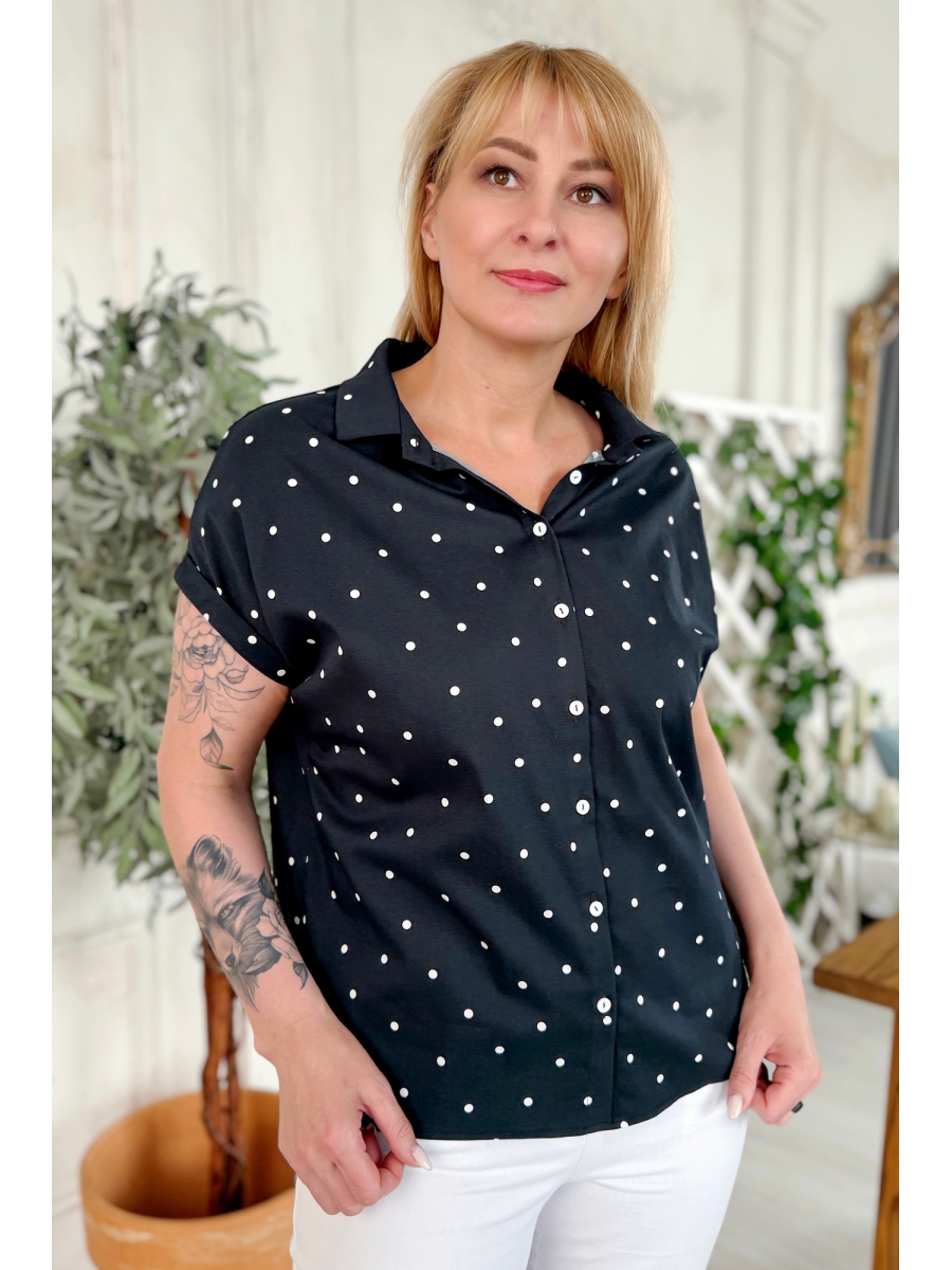 Блузка женская полуприлегающего силуэта со спущенным плечом. Блузка с притачной планкой на петлях-пуговицах. Горловина оформлена воротником со стойкой. Перед блузки сделан короче чем спинка (разница 10 см), по бокам разрезы. Пройма рукава обработана манжетой.