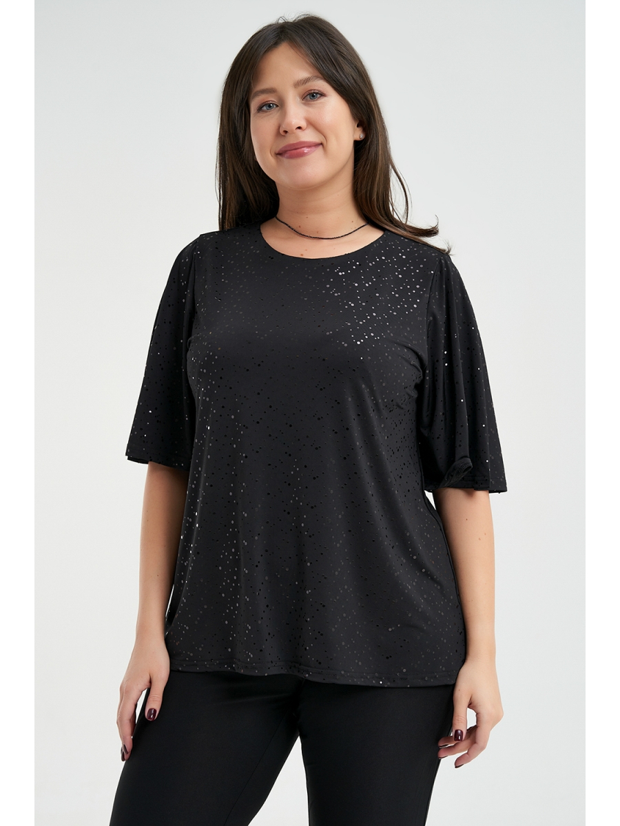 Нарядная блузка больших размеров выполнена из трикотажного полотна масло с пайетками, свободного кроя