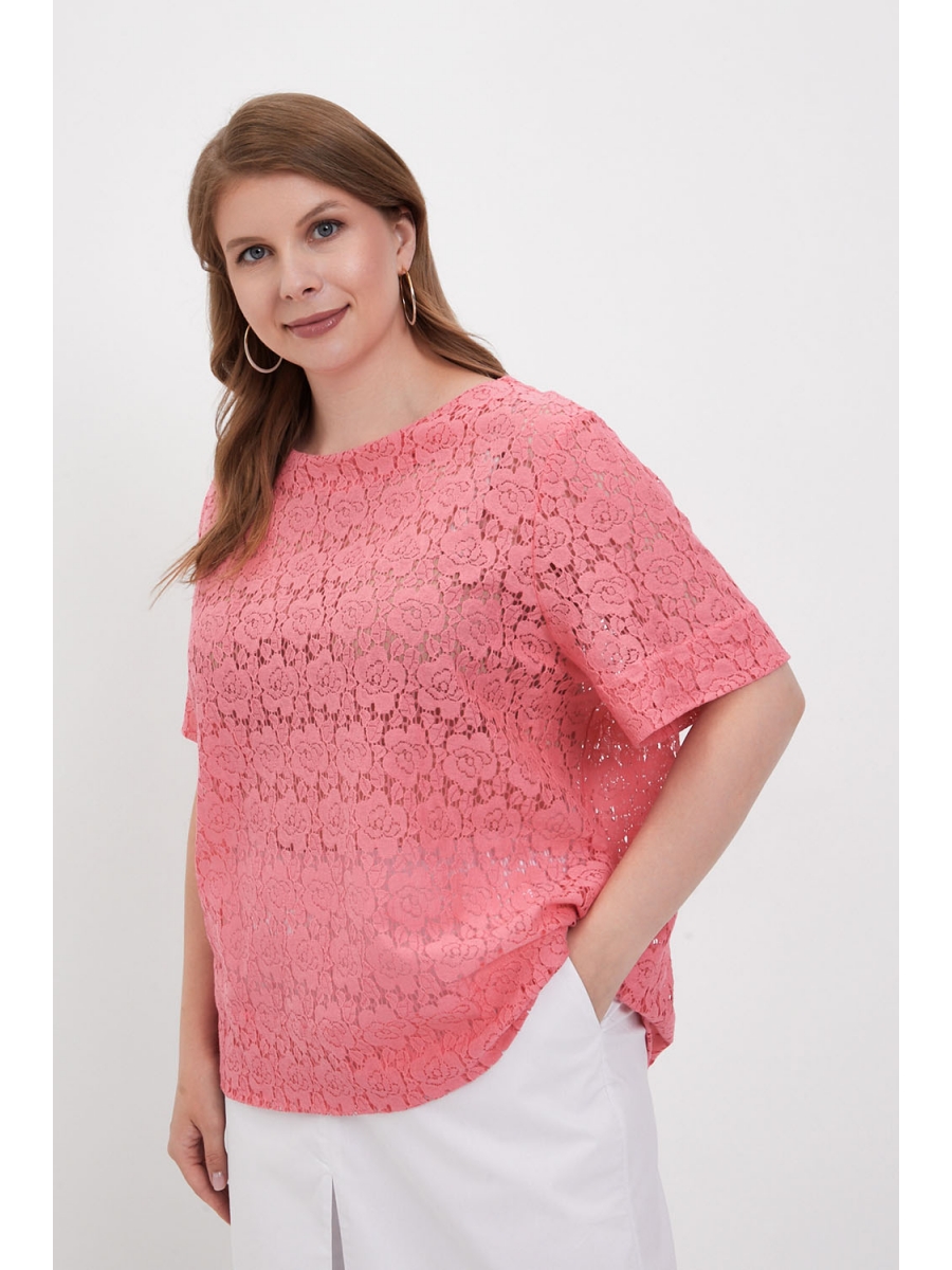 Женская блузка больших размеров прямого кроя с коротким рукавом, выруз лодочка. Выполнена из мягкого и приятного на ощупь текстильного полотна по типу гипюр.
