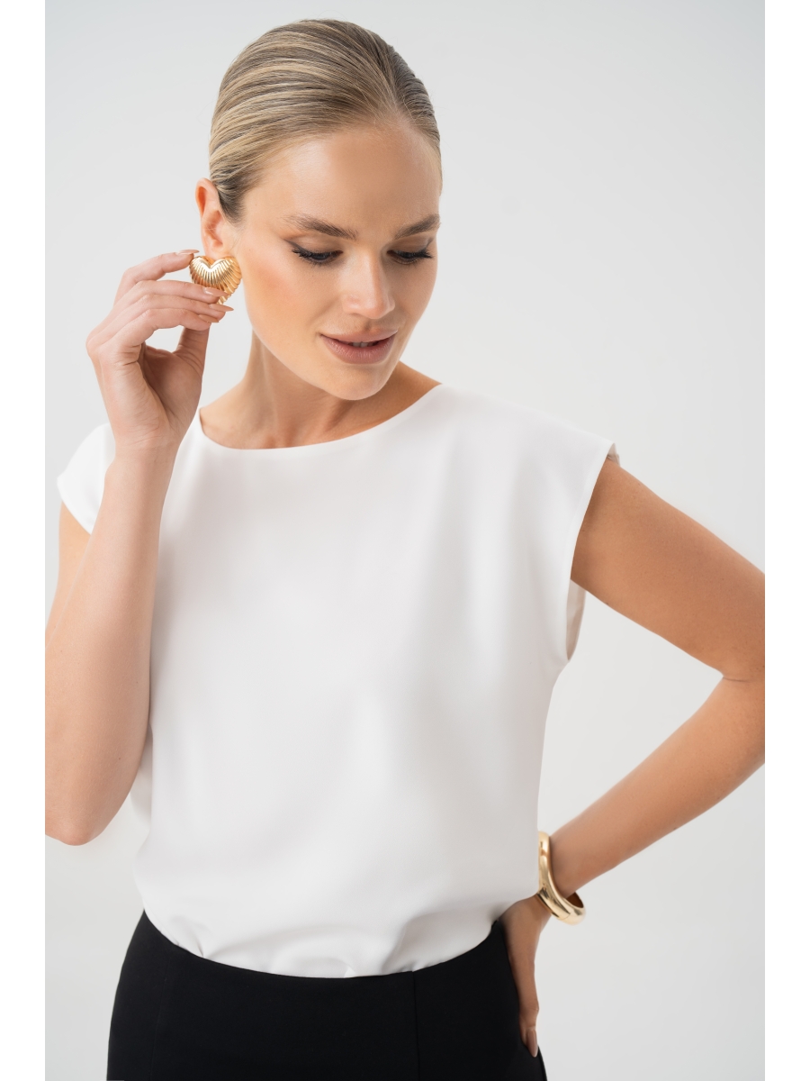 Блузка женская прямого силуэта, выполнена из ткани креп, может быть как нарядной, так и для повседневной носки. Перед с нагрудными вытачками, идущими из боковых швов. Спинка в верхней части с окантованным разрезом, застегивающимся на 1 навесную петлю и 1 пуговицу. Горловина округлой формы. Рукава втачные, одношовные, короткие.