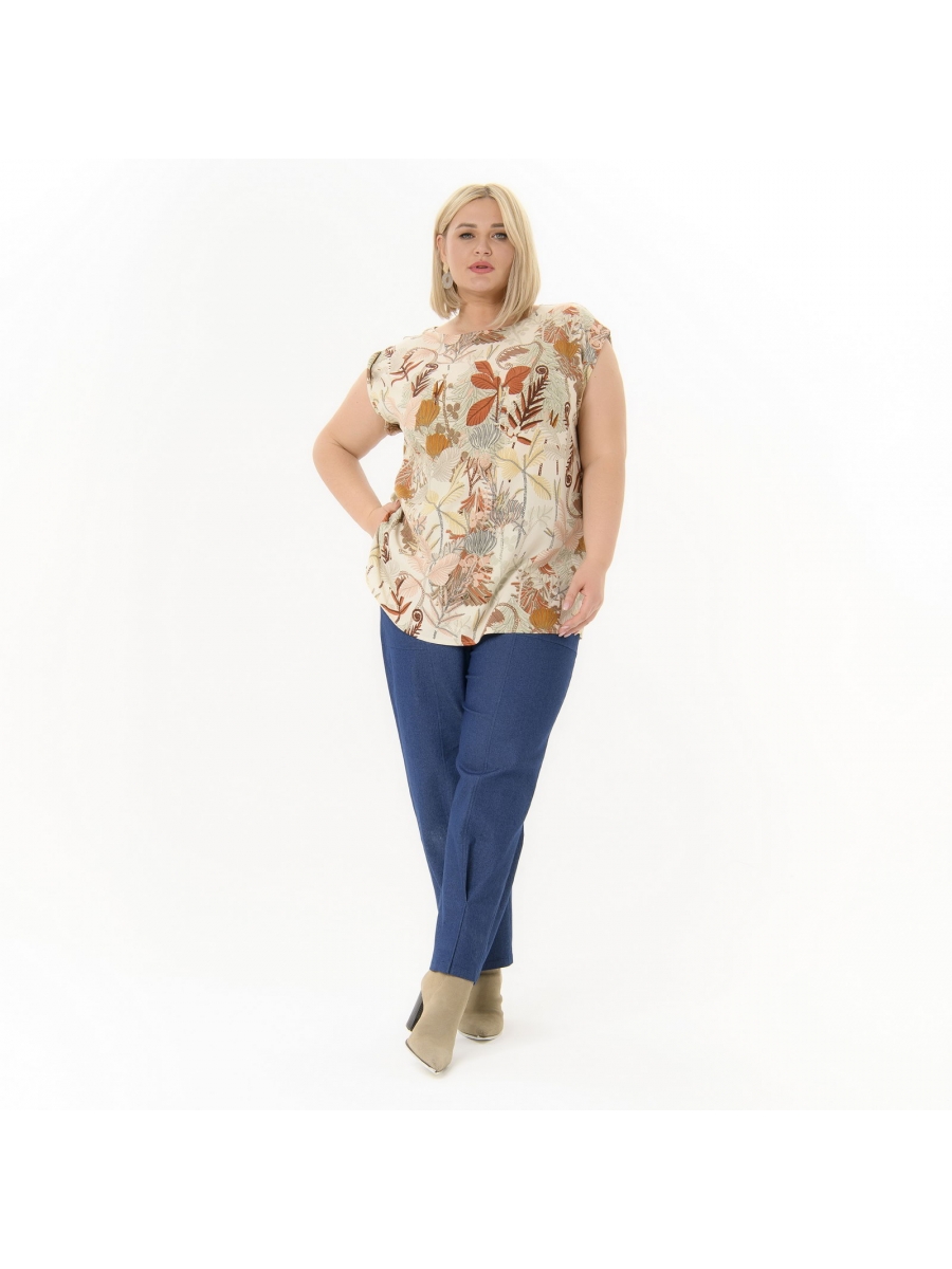 Блуза со спущенным плечом прямого кроя. Вырез горловины "лодочка". В боковых швах разрезы.