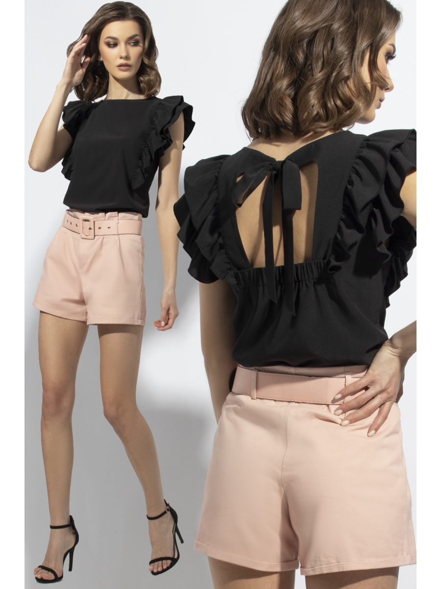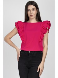 Блуза женская прямого силуэта. Перед и спинка с рельефами. В рельеф по переду и спинке вставлена рюша. На спинке завязывающийся бант. В пройму вставлено крылышко.