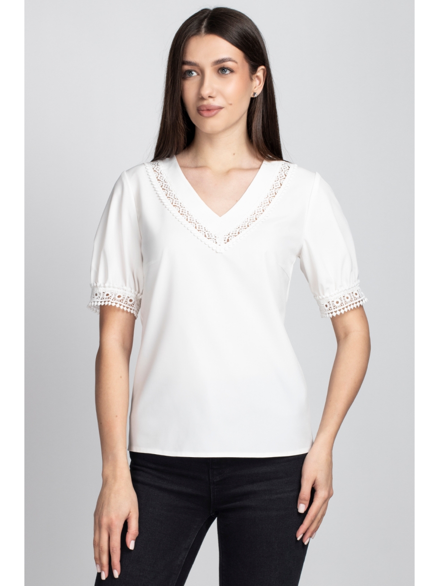 Передняя часть цельная с нагрудными выточками и V-образной горловиной с отделкой из кружева.