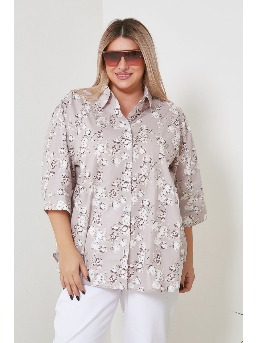 Рубашка свободного силуэта, из хлопковой ткани с принтом. Горловина оформлена отложным воротником на притачной стойке. Центральная застежка на петли и пуговицы. По переду подрезной бочок с небольшой сборкой в области талии. По спинке притачная кокетка, дополнена сборкой по центру спинки. Втачные рукава 3/4, со сборкой по окату на приспущеной линии плеча, по низу дополнены манжетами с застежкой на петлю и пуговицу. Низ с актуальным закруглением.
