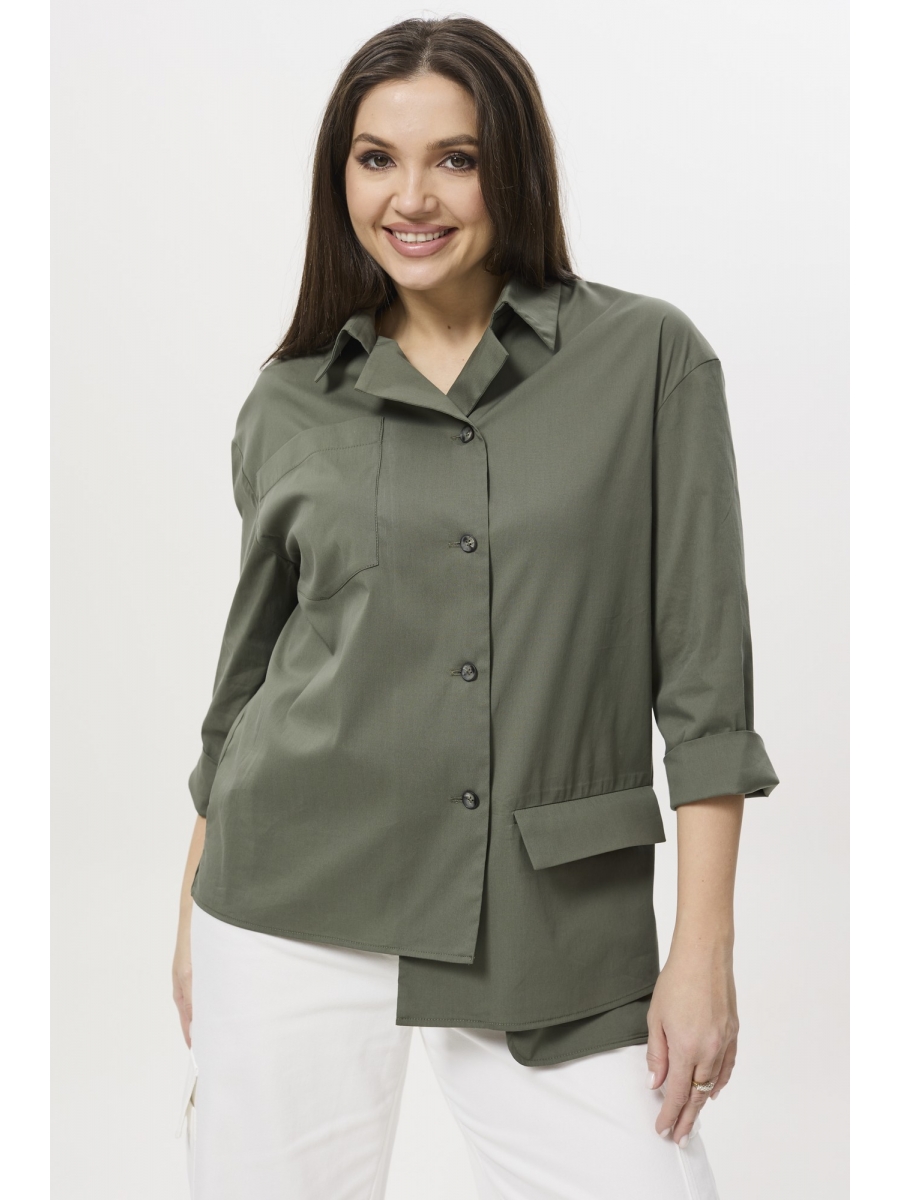 Воротник рубашечный. Застежка центральная на петли и пуговицы. На правой полочке функциональный накладной карман, на левой - прорезной карман с клапаном. Спинка цельная. Рукав втачной одношовный со спущеным плечом.