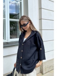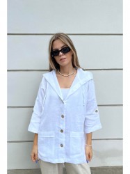 Блузон изготовлен из качественного мягкого льна с эффектом мятости прямого силуэта на пуговицах с капюшоном, со спущеной линией плеча. По переду накладные карманы. Рукав 3/4 с патой, застёгивается на пуговицу.