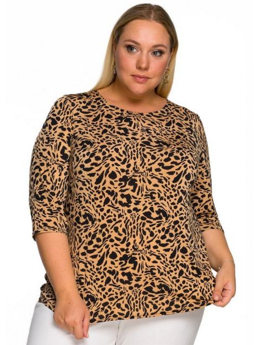 Базовая блуза из принтованного трикотажа "масло". Силуэт полуприлегающий. Вырез горловины округлый. Рукав 3/4.