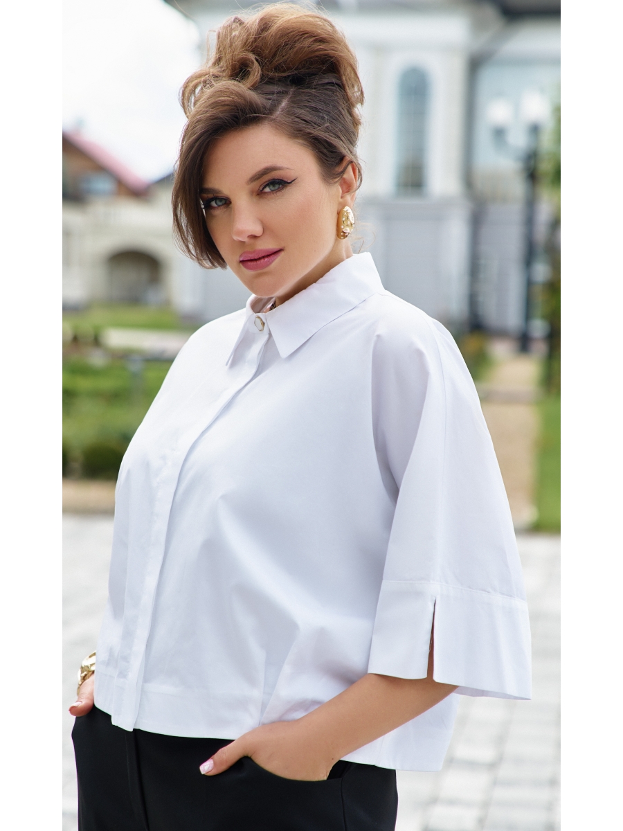 Наш хит в стильном исполнении. База, которая должна быть в Вашем гардеробе! Данная модель даёт возможность одеть ее не только на деловые офисные мероприятия, но и на вечерние торжественные события, дополнив ее аксессуарами. Блузка свободного силуэта, укороченная с ассиметричной линией низа, с центрально-бортовой потайной застёжкой на петли- пуговицы и воротником рубашечного типа. Низ блузки оформлен декоративными складками переходящими с левой детали на спинку. Спинка в блузке без особенностей. Рукав цельнокроеный с притачной широкой манжетой с декоративным разрезом по низу.