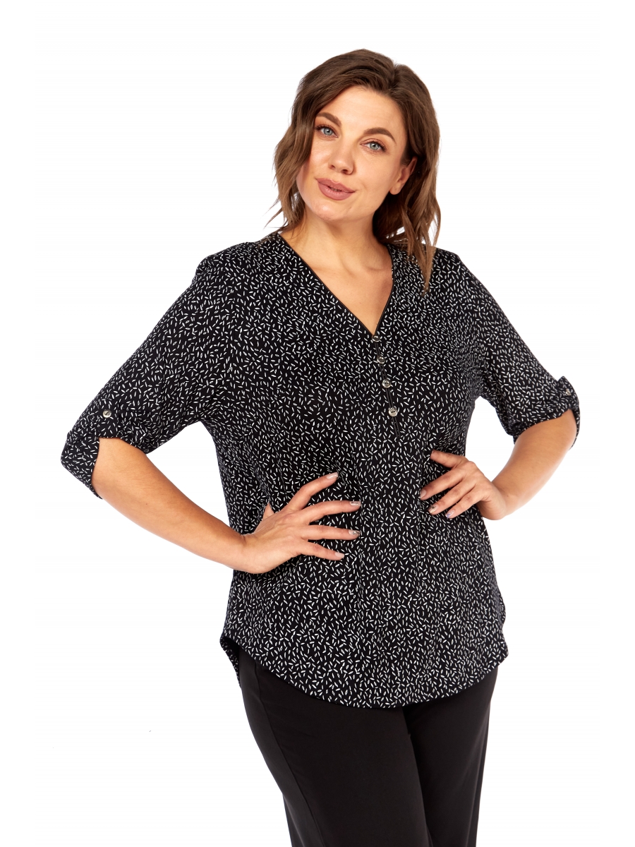 • Стильный принт ""мелкий листок"": Классическое сочетание глубокого черного цвета и изящного белого принта ""мелкий листок"" придает блузке динамичный и свежий вид. Этот универсальный рисунок позволяет легко комбинировать блузку с различными элементами гардероба.