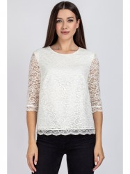Блуза женская полуприлегающего силуэта. Передняя часть данной блузки выполнена из основной ткани, на которую наложен гипюр. Блуза имеет нагрудные выточки, они обеспечивают хорошую посадку и форму. Спинка блузы цельная, без дополнительных декоративных элементов. Рукав втачной и сделан из отделочной ткани, которая также является гипюром.