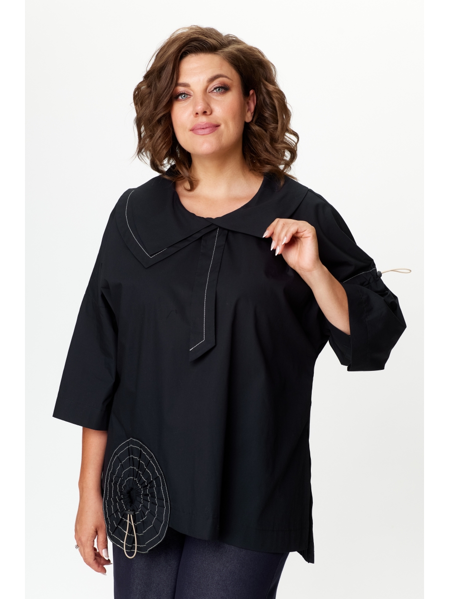 Женская хлопковая блуза в стиле «бохо» прекрасно вольется в повседневную жизнь и станет одной из любимых базовых вещей в Вашем гардеробе. Блуза свободного кроя, вырез горловины круглый с раскладным асимметричным воротником, по спинке скрепленным патой, а по переду с декоративным «галстуком». Рукав втачной 3/4, низ блузы так же с асимметрией и боковыми разрезами. Перед цельный, спинка разрезная с плечевой кокеткой, переходящей в рукав. Левый рукав - с кулиской и декоративной стяжкой. Так же по переду круглый декоративный карман-стяжка. Изделие хорошо сочетается как с брюками, так и с юбками, с классической и спортивной обувью.