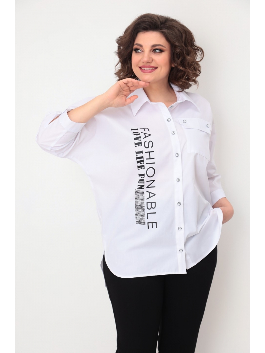 Оформить заказ →Блузка удлиненная, свободного кроя. Передняя часть блузы (полочка) свободного кроя без талиевых вытачек с накладным карманом. Застежка-планка с прорезными петлями на пуговицах. Спинка свободного кроя без талиевых вытачек. По центру спинки кокетка. Воротник рубашечного типа на стойке. Низ изделия с фигурными вырезами по боковому шву. Украшением изделия служит печать. Линия плеча спущенная, рукав притачной, по низу рукава манжет с застежкой на пуговицу. Подойдет для женщин разной возрастной категории и разного телосложения.