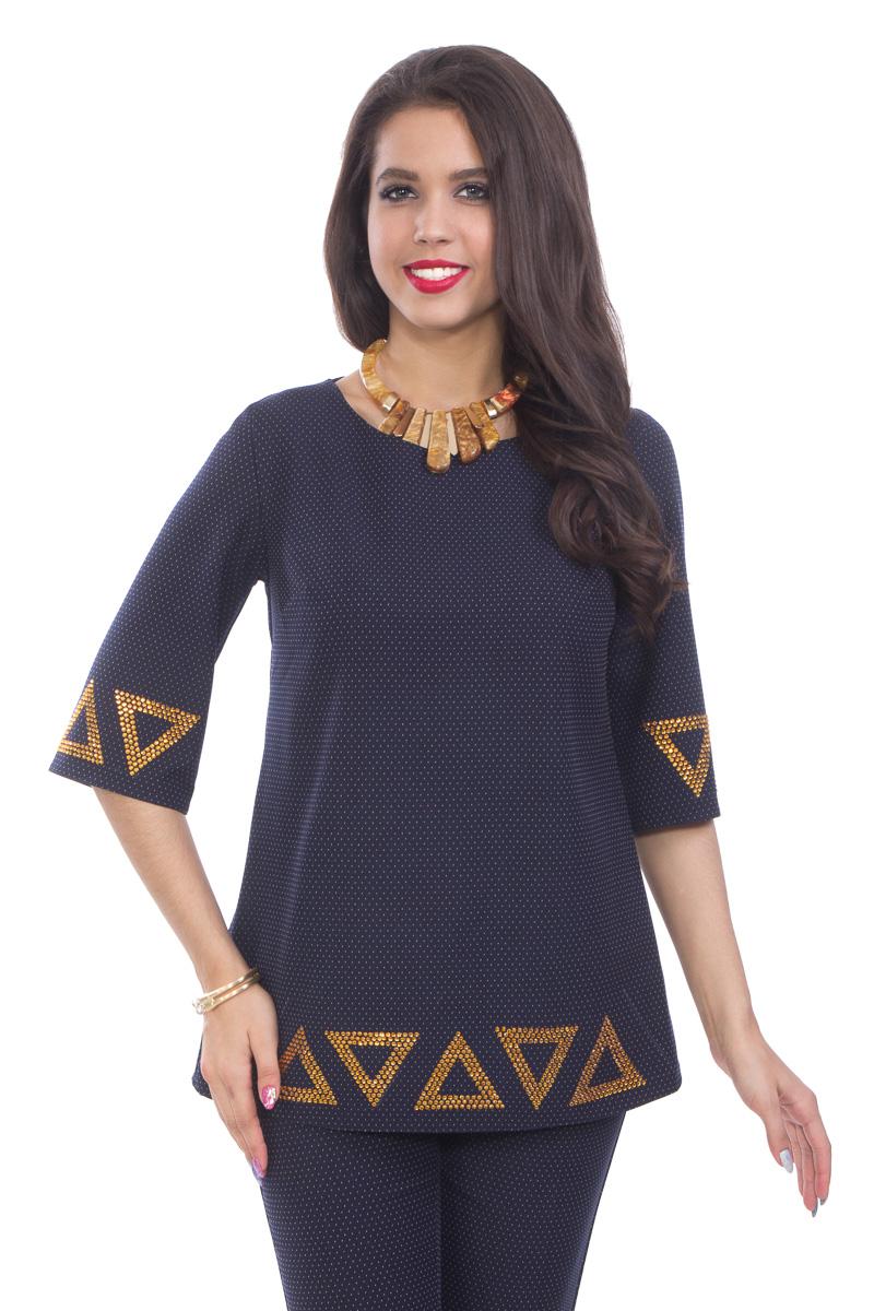 Элегантная блуза из текстильного полотна темно-синего цвета. Изделие по переду и низу рукавов декорировано геометрическим узором из страз. Круглый вырез горловины обработан внутренней обтачкой. Втачные рукава три четверти. По боковым швам блузы располагаются втачные карманы.