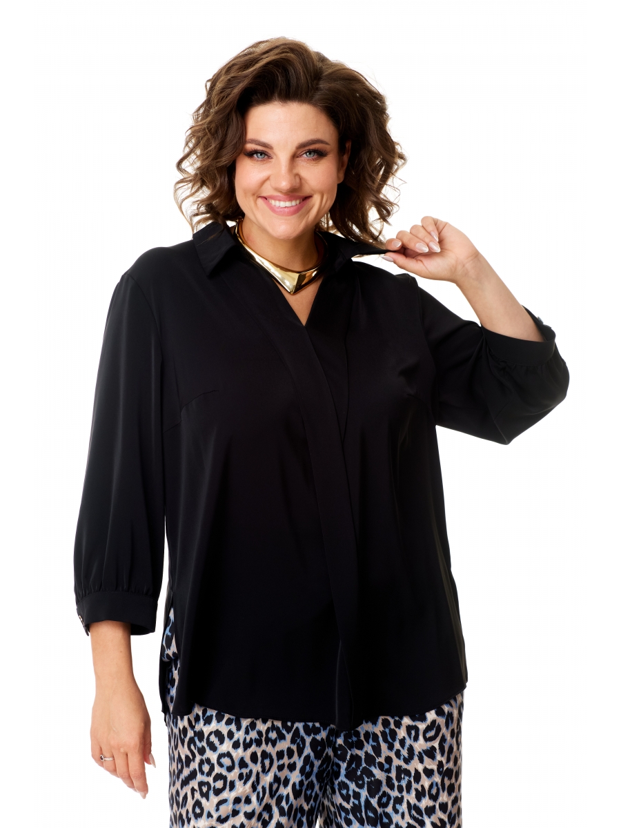 Блуза прямого силуэта. Рукав втачной. Низ рукава обработан манжетой с застёжкой на 1 петлю и пуговицу. Блузка без застёжки. Вырез горловины обработан декоративной планкой. Воротник рубашечный. По переду нагрудные выточки. Разрезы в боковых швах.