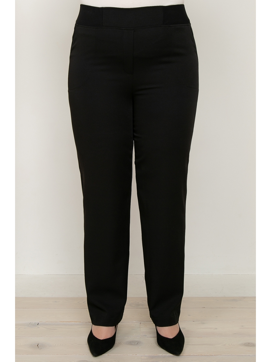 Брюки женские прямого силуэта, с боковыми кармвнами. Перед с имитацией гульфика. Верх брюк на притачном широком поясе из трикотажного полотна с эластичной тесьмой.