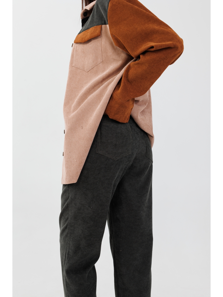 На задней части брюк обработаны притачные кокетки и накладные карманы.