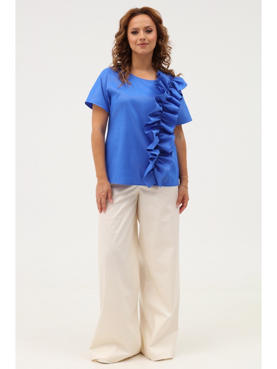 Брюки широкие прямые с высокой посадкой, на поясе со вставками из эластичной тесьмы. В боковых швах имеются функциональные наклонные карманы.