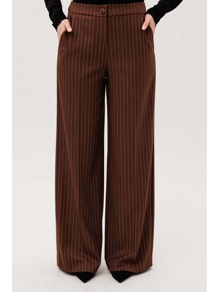 Элегантные женские брюки прямого кроя, по переду на брючинах стрелки. Модель с высокой посадкой на притачном поясе обеспечивает идеальное прилегание. Спереди расположена практичная застежка на тесьму-молнию, добавляющая удобства при носке. Брюки укомплектованы функциональными боковыми карманами, что придает модели дополнительную практичность и удобство.