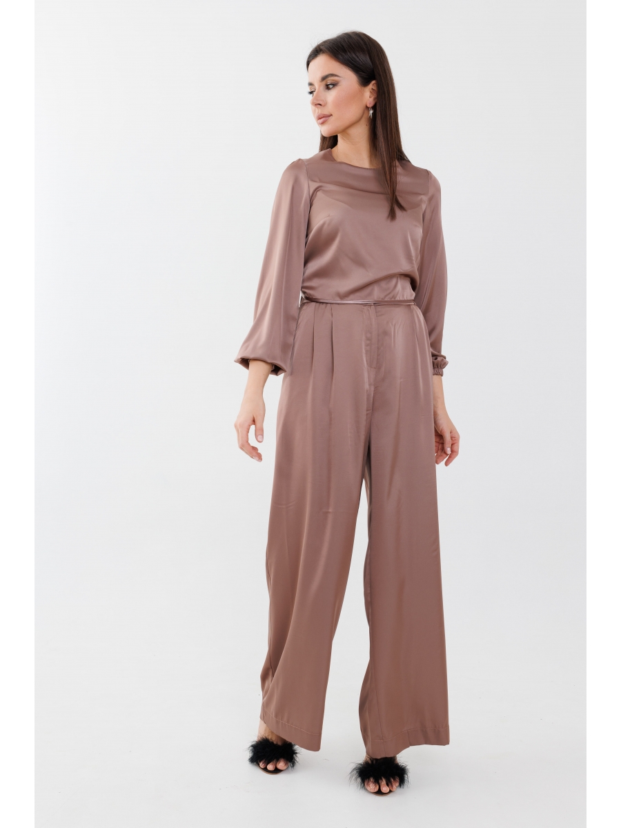 Брюки женские, высокая посадка, длинные, расширенные к низу. По переду защипы моделирующие фигуру и боковые карманы. По спинке талиевые вытачки. Притачной пояс на петли пуговицы, по переду застежка молния, по спинке вшита эластичная лента, есть шлевки.