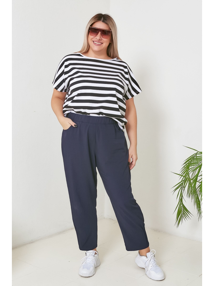 Легкие укороченные брюки, зауженные к низу, выполнены из хлопковой ткани стрейч. Модель с комфортной посадкой на талии, без застежки. Верх с широким поясом на резинке. По центру переда имитация гульфика, по бокам карманы с подрезным бочком. Задние половинки брюк дополнены кокеткой и прорезными листочками. Низ брюк заужен за счет декоративных мелких складок.