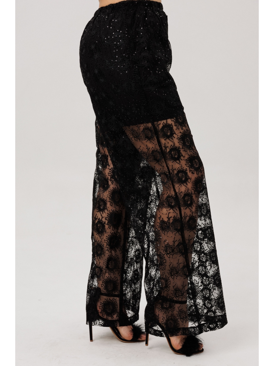 Волнующий шёпот гипюра и танец мерцающих пайеток. Эти брюки «звездная паутинка» не просто деталь образа, а его поэтичное завершение, где дерзость встречается с изящностью.
