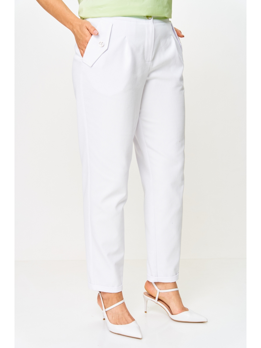 Брюки женские из джинсовой ткани, полуприлегающего силуэта, слегка заужены к низу. По переду брюк расположена складка. Карман в боковом шве оформлен клапаном. Пояс притачной, по задней части резинка. Застежка брюк на петлю-пуговицу и молнию.