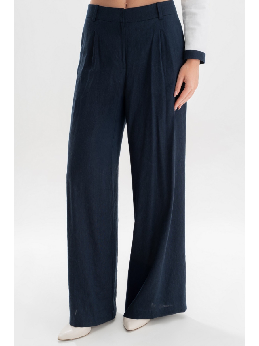 Стильные брюки из лёгкого натурального льна — идеальный выбор для тёплого сезона. Свободный прямой крой обеспечивает комфорт на каждый день, а аккуратные складки спереди придают образу утончённости. Тёмно-синий цвет легко сочетается с базовыми и яркими элементами гардероба.