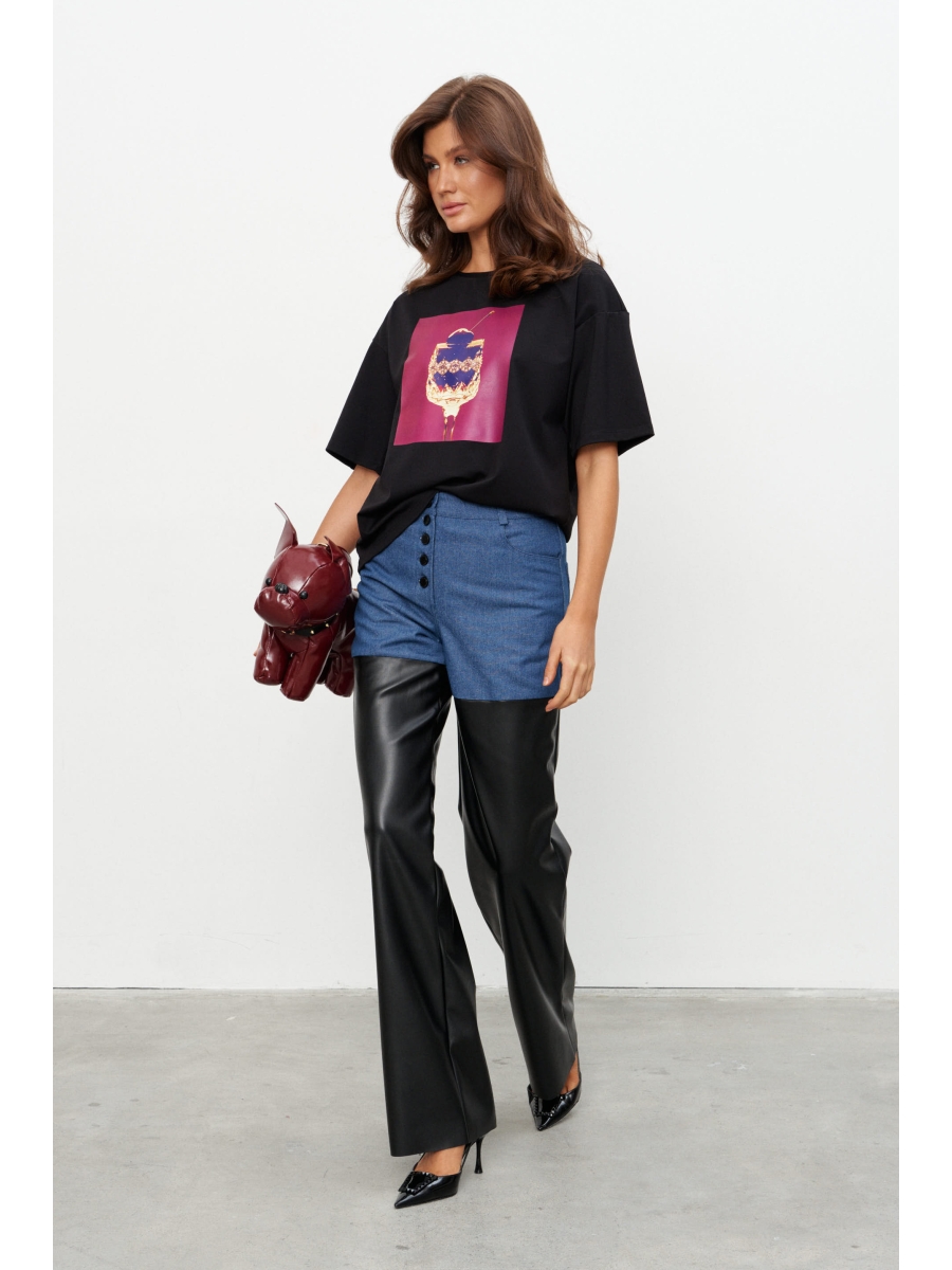 Брюки прямого силуэта выполнены на сочетании плотного джинса и экокожи. Брюки на поясе со шлёвками и застежкой на металлические пуговицы-болты. По переду два прорезных кармана, по спинке - два накладных.
