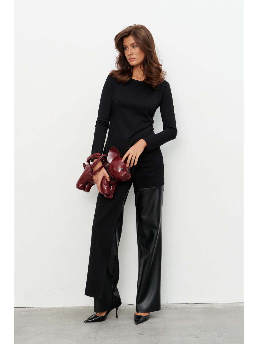Брюки прямого силуэта выполнены на сочетании плотного джинса и экокожи. Брюки на поясе со шлёвками и застежкой на металлические пуговицы-болты. По переду два прорезных кармана, по спинке - два накладных.