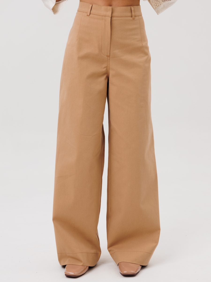 Брюки расширенные книзу на притачном поясе из джинсовой хлопковой ткани. По поясу настрочены шлевки. По передним и задним частям брюк вытачки. На задних частях брюк настрочены карманы.