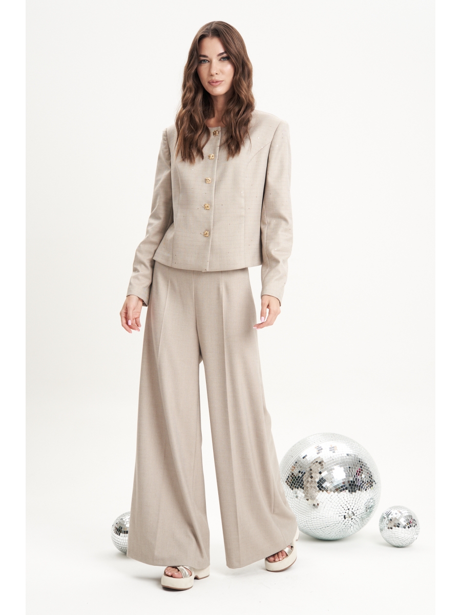 Брюки-палаццо широкие внизу и прилегающие вверху, с талиевыми вытачками по передним и задним половинкам. Застёжка по боковому шву.