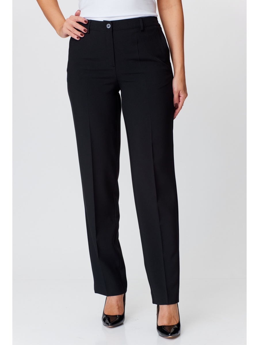 Брюки прямые, классические, с заутюженными стрелками, по переду обработаны карманы с отрезным бочком, застежка на тесьму-молнию и 1 пуговицу. На задних половинках обработаны вытачки и имитация карманов с листочкой, пояс в брюках притачной, сбоку на резинке.