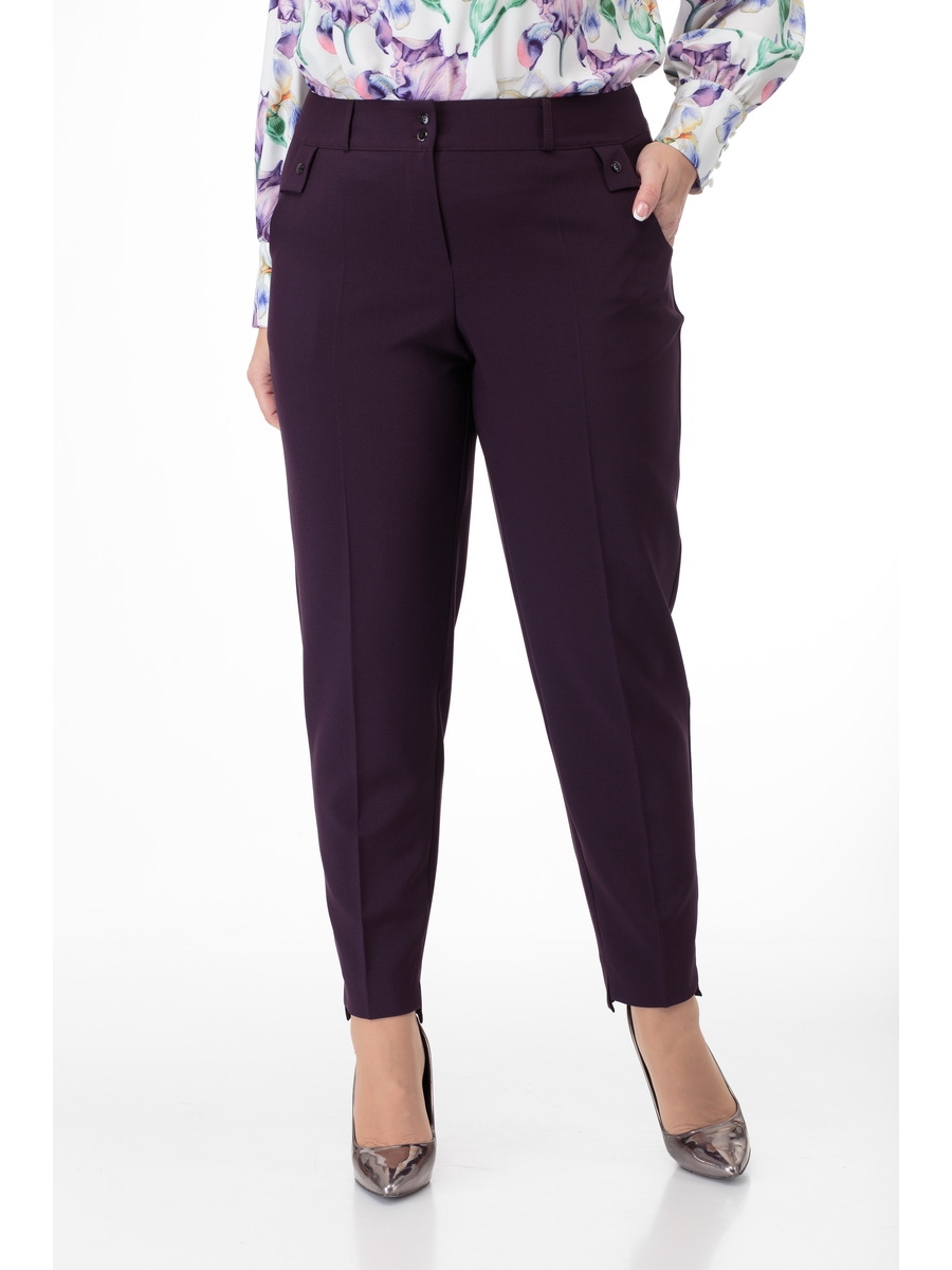 Брюки классические, слегка заужены к низу, с ассиметричным низом, боковые карманы с закруглённым входом и патой; на задних половинках не рабочие карманы с листочкой, пояс-обтачка притачной.