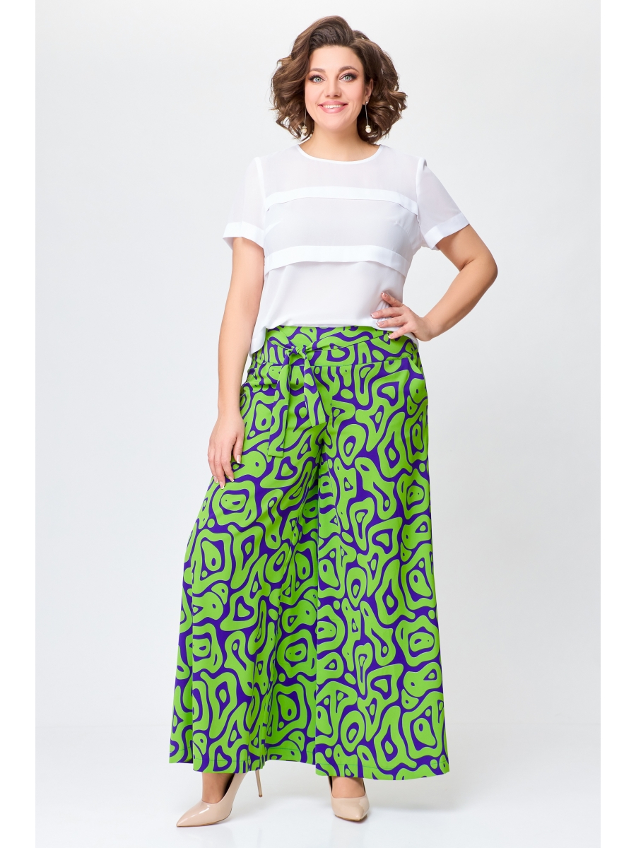 Брюки из мягкой вискозной ткани свободного кроя, чуть расширены к низу. Сверху широкая обтачка со шлевками для съёмного пояса. Спереди боковые косые карманы. Застежка на потайную тесьму-молнию в боковом шве.