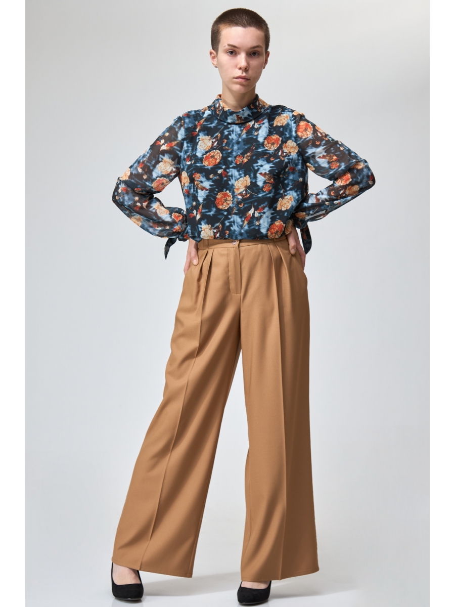 Брюки широкие длинные, с заутюженными стрелками, с высокой посадкой. На передних половинках складки. Пояс притачной с застежкой на молнию, петли и пуговицы, со вставками эластичной тесьмы по бокам. В боковых швах расположены карманы с косым входом.