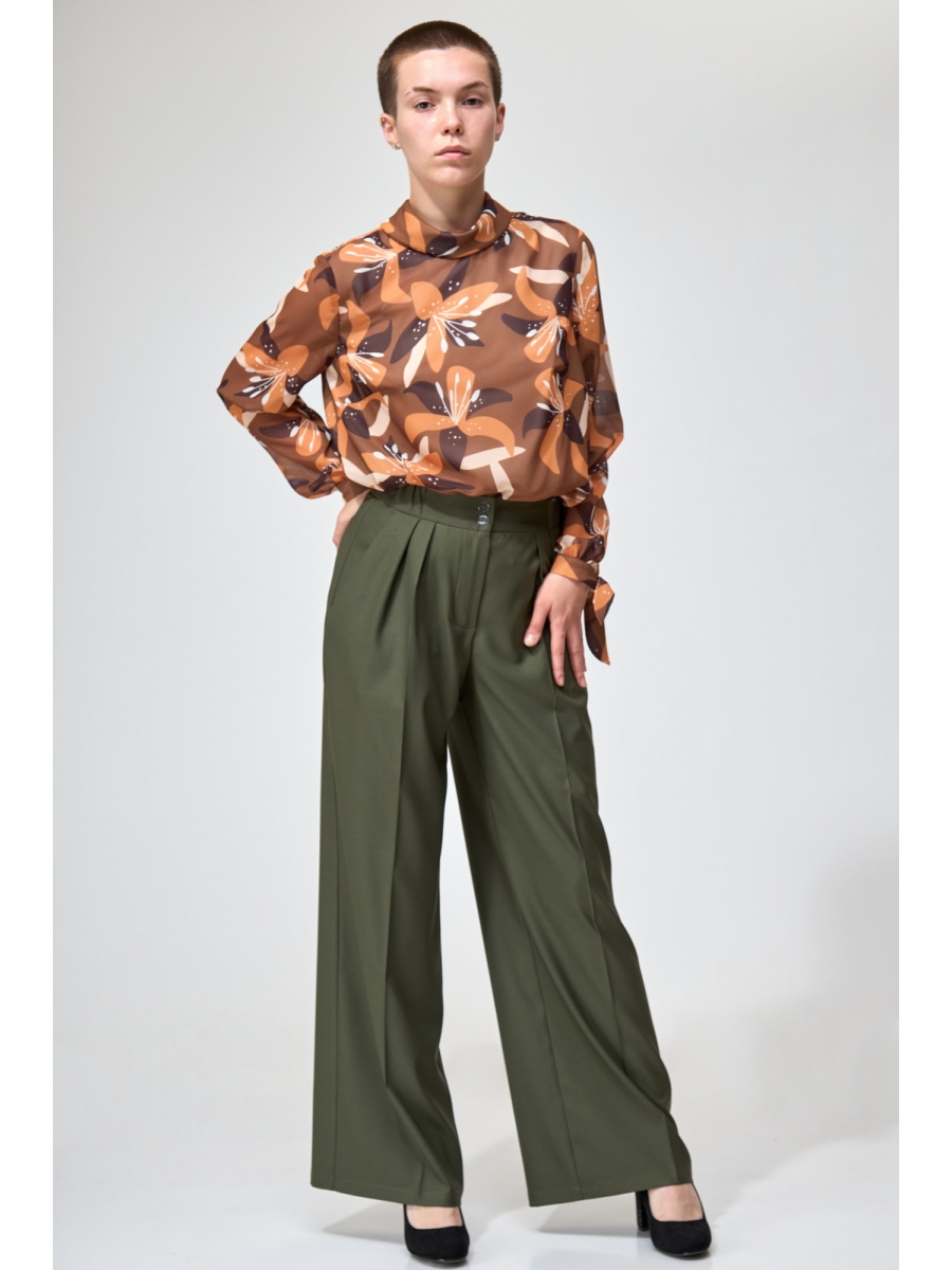 Брюки широкие длинные, с заутюженными стрелками, с высокой посадкой. На передних половинках складки. Пояс притачной с застежкой на молнию, петли и пуговицы, со вставками эластичной тесьмы по бокам. В боковых швах расположены карманы с косым входом.