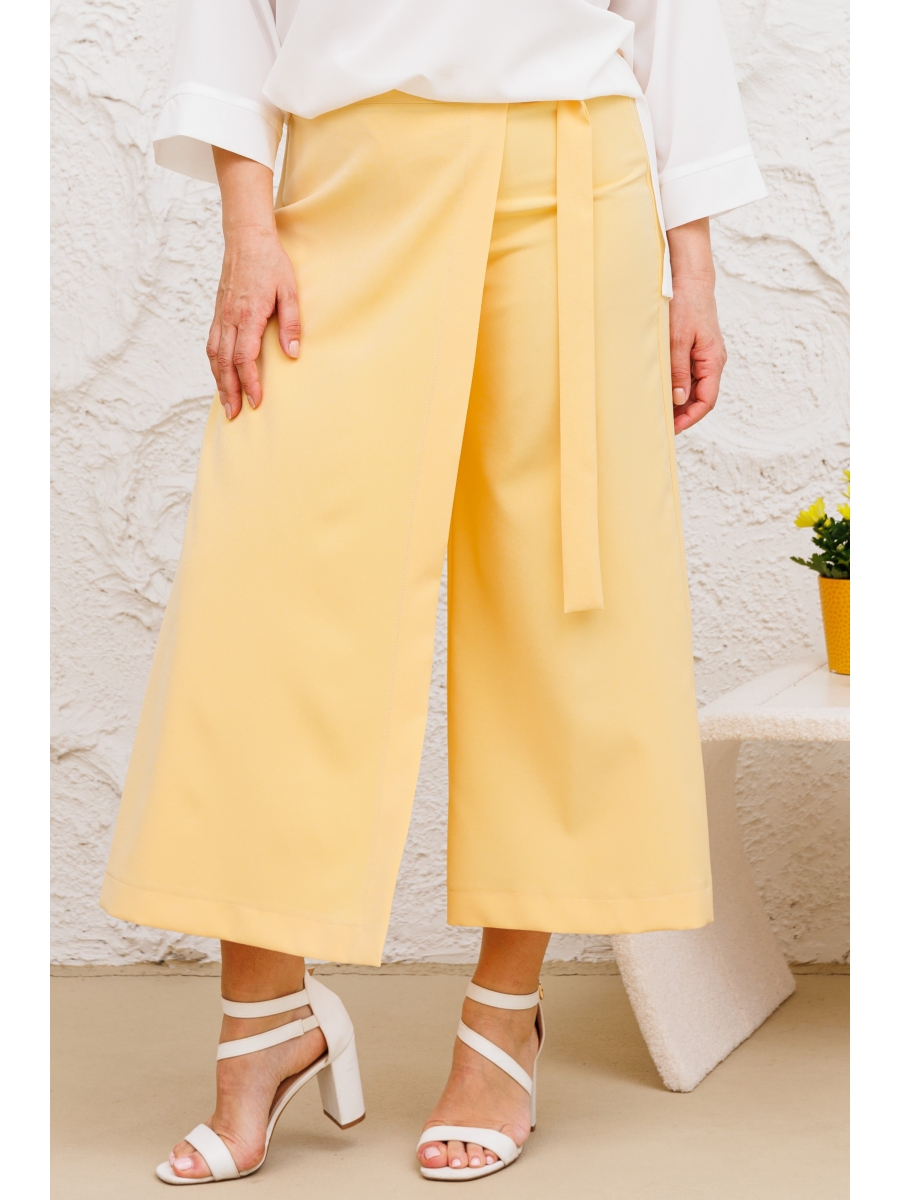 Модные брюки-кюлоты с элегантным запахом, свободной посадки, брючины широкие укороченные, чуть выше щиколотки. По переду молния, сзади по поясу вставлена резинка, запах фиксируется поясом на пряжке.