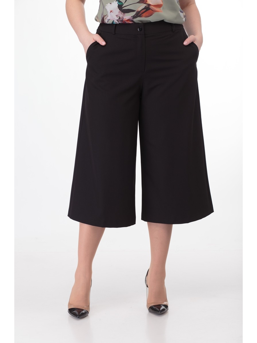 Классические брюки-кюлоты на притачном поясе. Кюлоты комфортного свободного силуэта умеренного объема. Линия талии брюк на естественном месте. На передних частях обработаны карманы, на задних - вытачки.