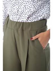 Брюки длиной по щиколотку, на передних частях брюк обработаны боковые карманы с наклонным входом, на брюках заутюжены стрелки, переходящие в складку по линии талии на передних частях.